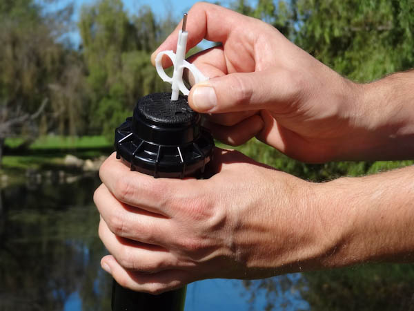- Insert the plastic key end of the Hunter wrench into the lifting socket of the sprinkler and turn 90°. Pull the riser up to gain access to the nozzle socket