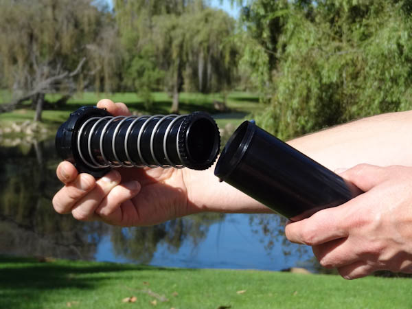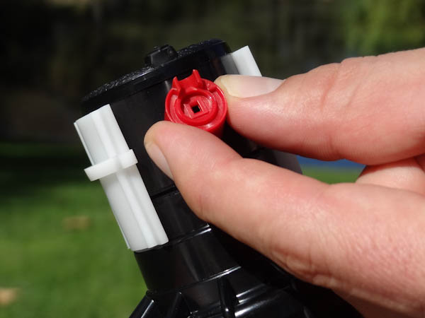 Another way to reset the right arc is to unscrew the body cap counterclockwise and remove the internal assembly from the body. Once removed, rotate the nozzle turret to the right stop, screw the internal assembly back into the body with the nozzle aligned to the right side of the area you want irrigated. At this point you have realigned the right arc stop, and you can adjust the left arc to an appropriate setting.